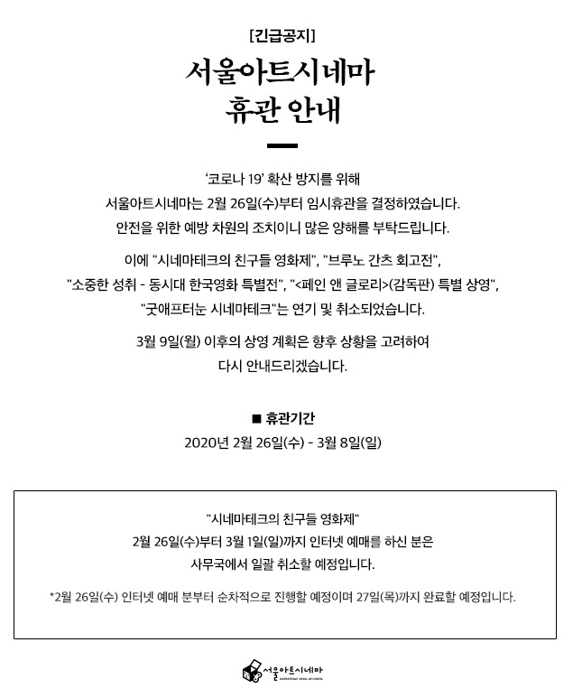 | 자유게시판 | [영화제 정보] 2020 제 15회 시네마테크의 친구들 영화제(+휴관 공지 ) | 2020.02.08 |