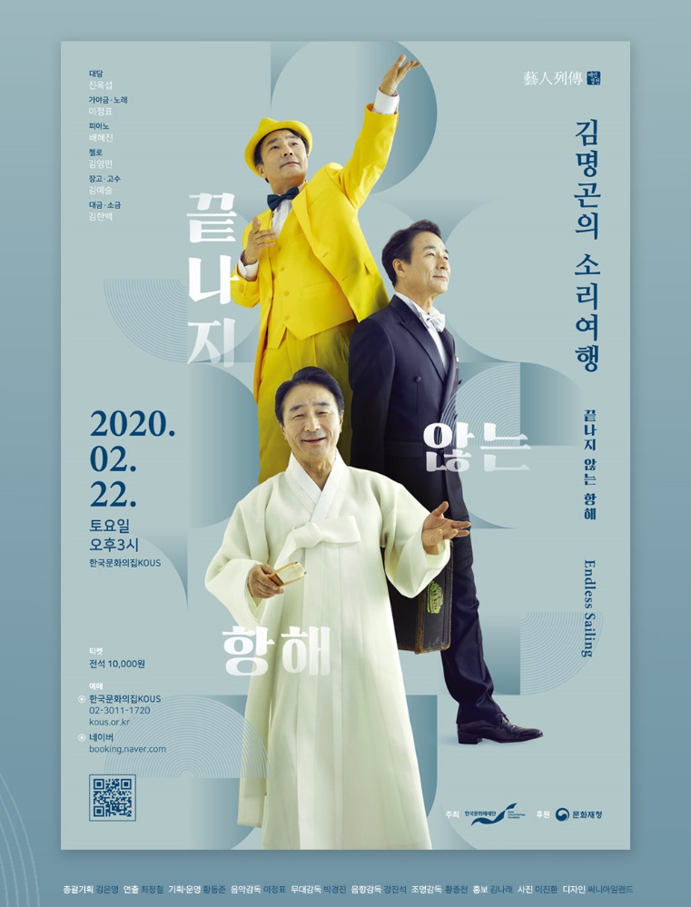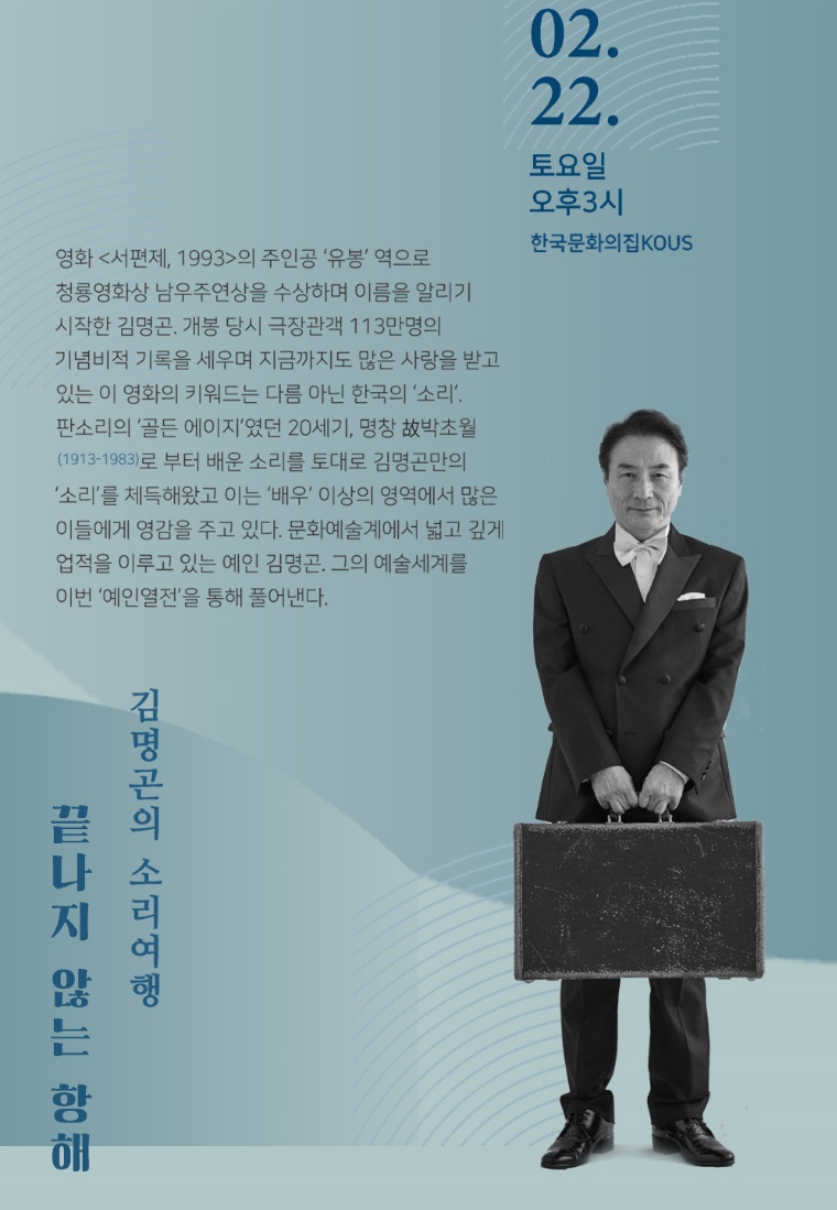 예인열전(藝人列傳)-김명곤의 소리여행(Endless sailing) •내용: 서양악기와 국악기와의 조화를 이끄는 김명곤의 소리여행! 영화 <서편제, 1993>의 주인공 ‘유봉’ 역으로 청룡영화상 남우주연상을 수상하며 이름을 알리기 시작한 김명곤. 개봉 당시 극장관객 113만명의 기염을 이루며 판소리 대중화에 정렬을 불태웠던 그의 새로운 도전이 시작된다. •출연 •기간: 2020.02.22. •시간: 토요일 오후 3시 •티켓: 전석 10,000원 (예술인 패스 소지자 50% 할인 / 국가유공자·장애인·의상자 50%할인) •문의: 02-3011-1720 •예매링크 (★ 상세 정보 클릭 ★)