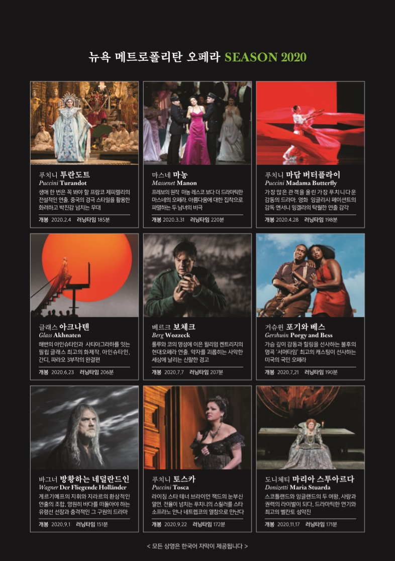 뉴욕 메트로폴리탄 오페라가 매일 1편씩 인터넷을 통해 무료로 온라인 공연서비스를 진행하고 있다. 코로나-19 확산으로 공연이 취소돼 아쉬움을 느끼는 전세계 오페라 애호가들을 위해 인터넷으로 공연을 즐길 수 있도록 배려한 것.