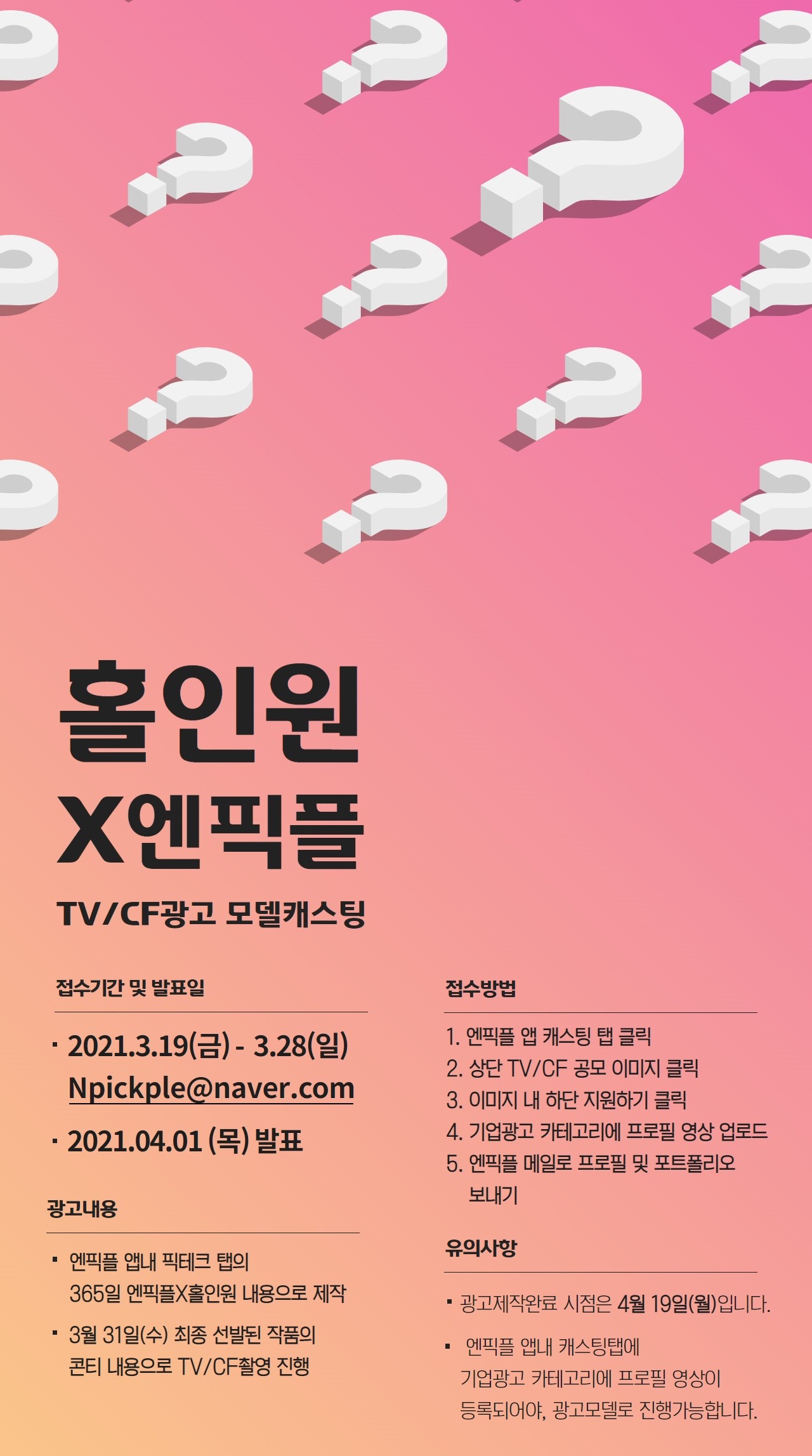 | 자유게시판 | [TV/CF광고] 엔픽플 홀인원 광고 모델 모집합니다. | 2021.03.23 |