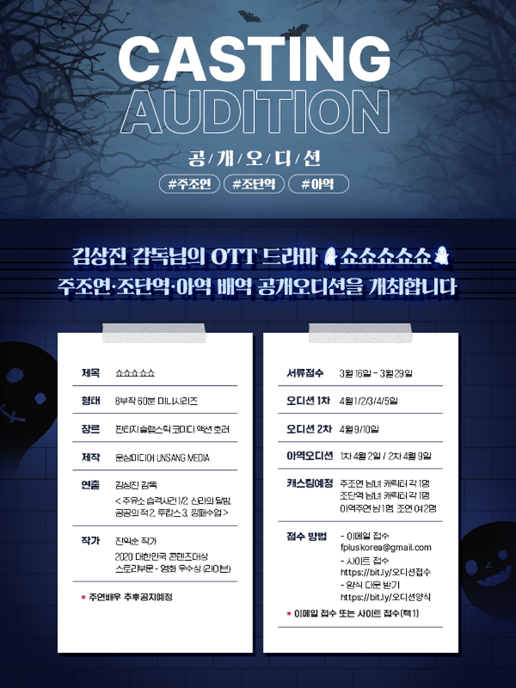 안녕하세요. 이번에 김상진 감독님이 진행하는 OTT드라마 오디션이 진행 합니다. 꿈을 품고 노력하는 모든 연기 지망생분들의 진심으로 응원하며 여러분이 꿈을 이루는 그 날까지 F+PLUS가 함께 하겠습니다. 많은 관심과 지원 부탁드립니다.