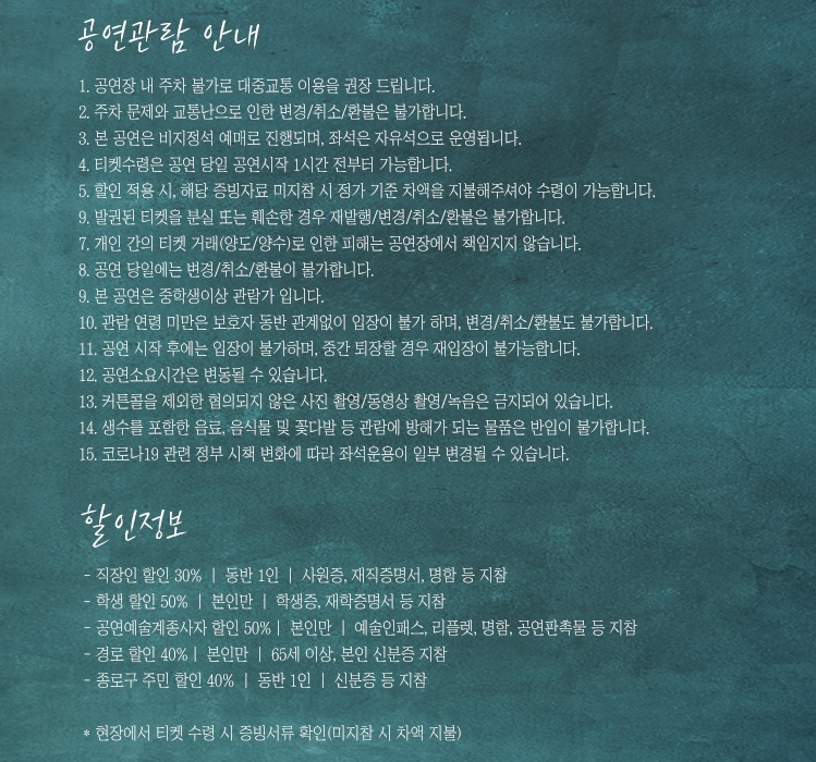 ○ 기간 : 2023년 4월 18일(화) ~ 5월 7일(일) ○ 시간 : 평일 오후 7시 30분 | 토, 일, 공휴일 오후 3시 (월요일 쉼) ○ 런타임 : 100분 ○ 티켓가격 : 정가 30,000원 지인할인 20,000원 배우할인 15,000원 중고생할인 15,000원