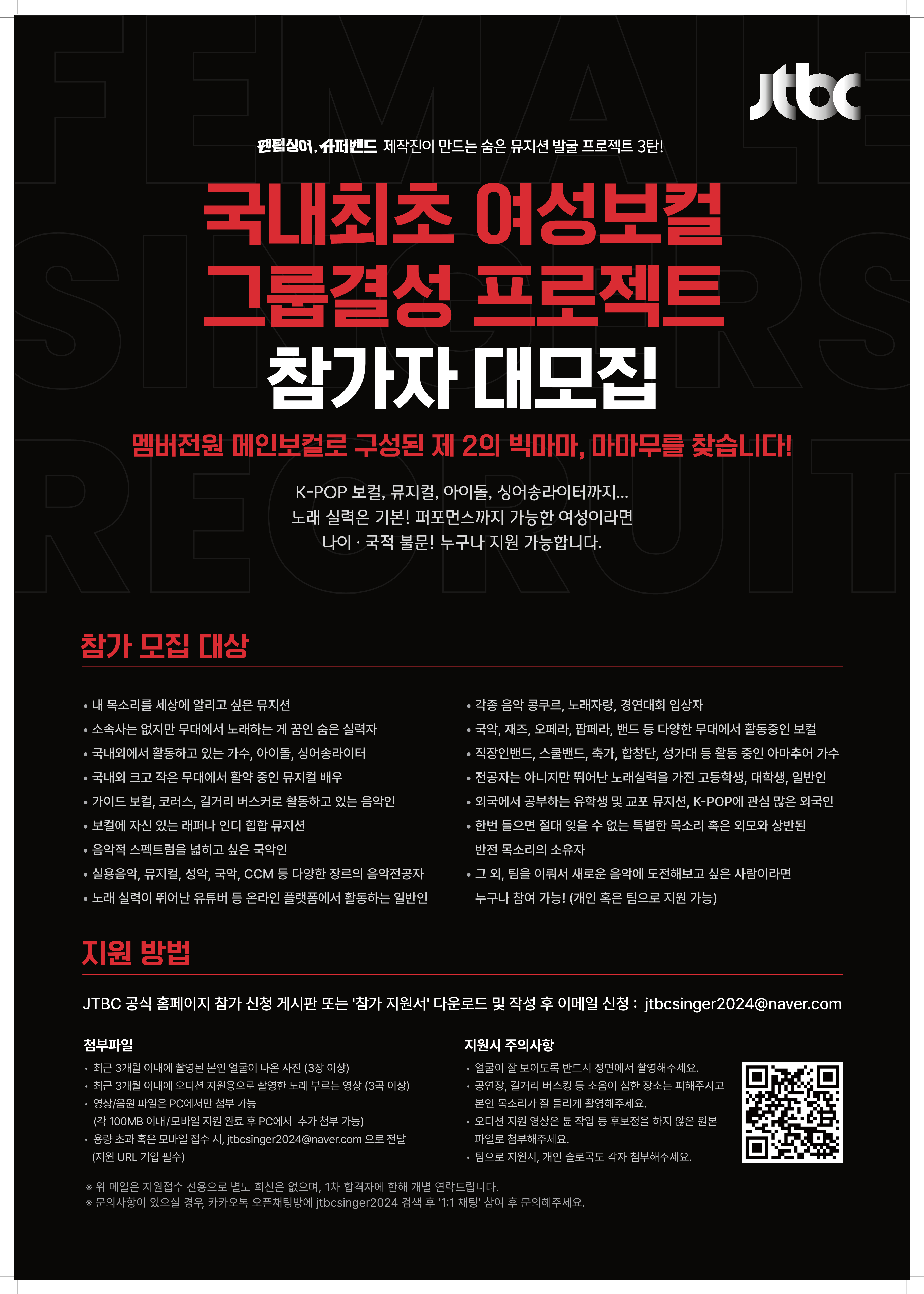 <팬텀싱어>, <슈퍼밴드> 제작진이 만드는 ‘숨은 뮤지션 발굴 프로젝트’ 3탄! 자세한 내용은 아래의 모집포스터와 공식 홈페이지 참고해주세요♬ 음악을 사랑하는, 가창력이 뛰어난 분들의 많은 관심과 참여 부탁드립니다. https://tv.jtbc.co.kr/ticket/pr10011623/pm10067782 * 궁금한 점이나 문의사항이 있는 경우