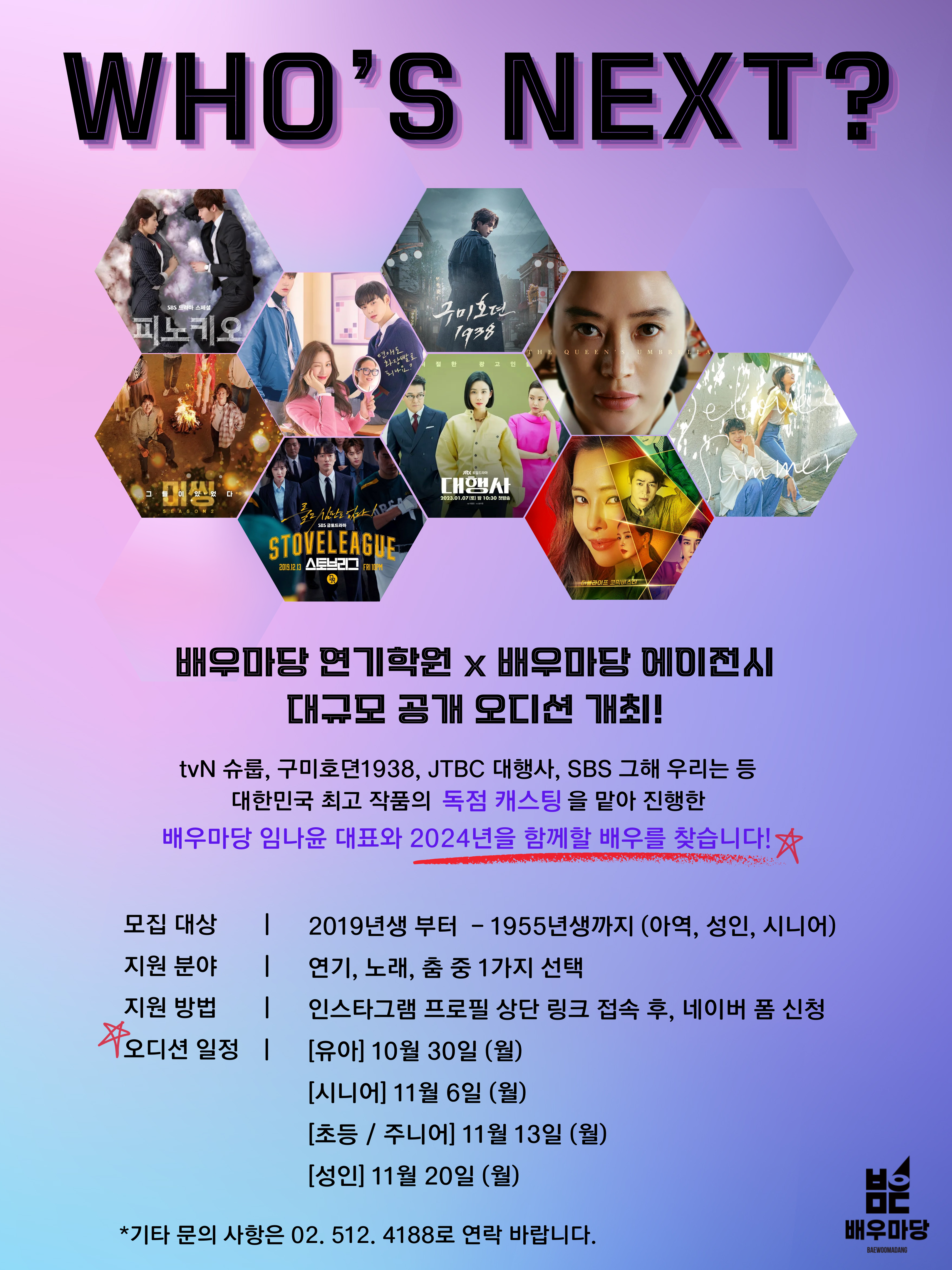 배우마당 연기학원 x 배우마당 에이전시가 함께하는 대규모 공개 오디션 [Who's next?] 개최 안내 tvN 슈룹, 구미호뎐, JTBC 대행사, SBS 그해 우리는 등 대한민국 최고 작품의 독점 캐스팅을 맡아 진행한 배우마당 임나윤대표와 2024년을 함께할 배우를 찾습니다!