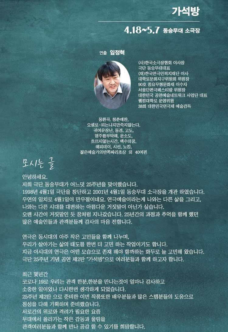 | 자유게시판 | [연극] 가석방- 극단 동숭무대 25주년 기념공연 2탄 | 2023.04.24 |