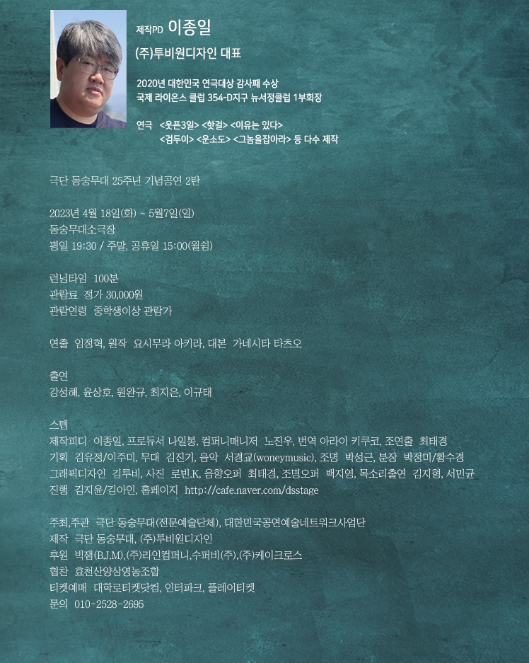 ○ 기간 : 2023년 4월 18일(화) ~ 5월 7일(일) ○ 시간 : 평일 오후 7시 30분 | 토, 일, 공휴일 오후 3시 (월요일 쉼) ○ 런타임 : 100분 ○ 티켓가격 : 정가 30,000원 지인할인 20,000원 배우할인 15,000원 중고생할인 15,000원