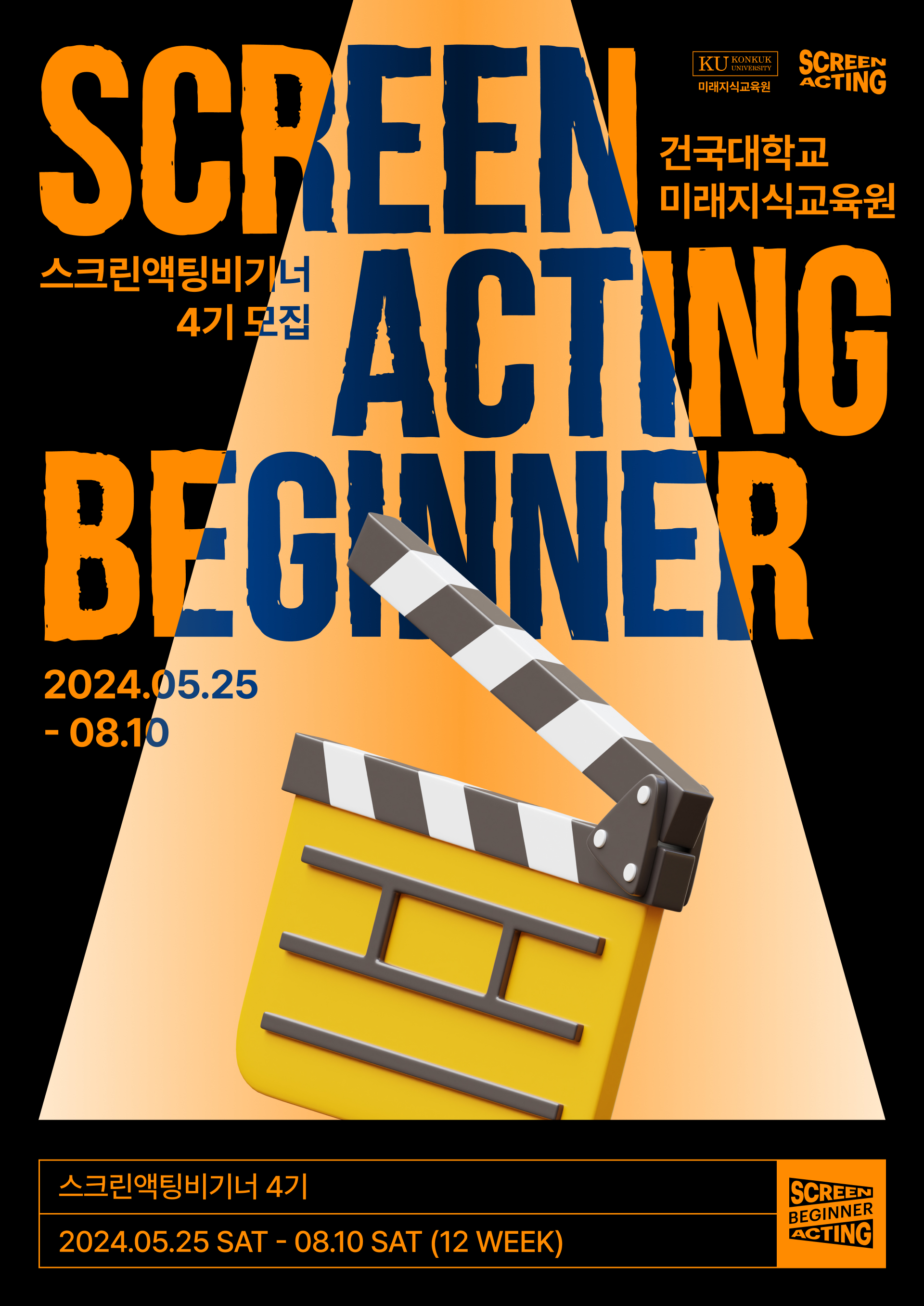 안녕하세요! 건국대학교 미래지식교육원 스크린액팅과정입니다. 2024학년 1학기 스크린액팅비기너 4기 정규과정을 오픈합니다. 연기자 및 연기자 지망생분들의 많은 관심 부탁드리며, 아래의 링크를 통해 수강정보를 확인하실 수 있습니다. 많은 관심 부탁드립니다! :) https://linktr.ee/KUSCREENACTING